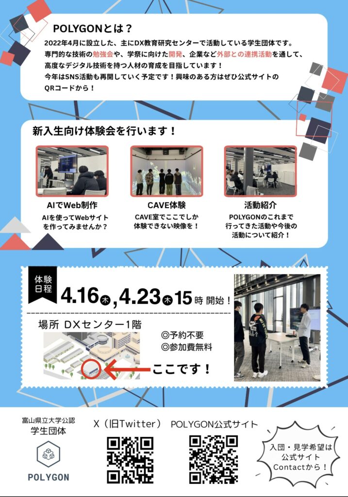 日時は4/16,23(木) の15:00〜、場所はDX教育研究センター1Fです。 これまでの活動の中で作成してきたものやDXセンターの機器の体験、活動内容などについてより詳しく説明を行います!